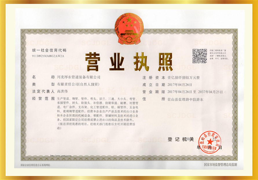 河北厚东管道装备有限公司位于“管道装备制造业基地”河北盐山开发区,地理位置优越,交通十分便利。公司注册资金1.88亿元、占地面积108亩。公司于2008年建厂,2017年成立“河北厚东管道装备有限公司”,公司现拥有职工160人,各类专业技术人员30余人。是一家集钢管管件、防腐保温、管道技术开发制造,管道配件制造,管道运输配送,国内外贸易为一体的大型工贸集团公司。
